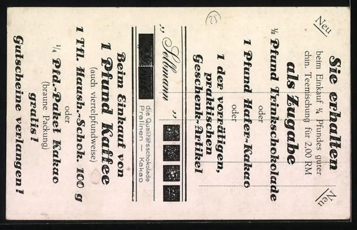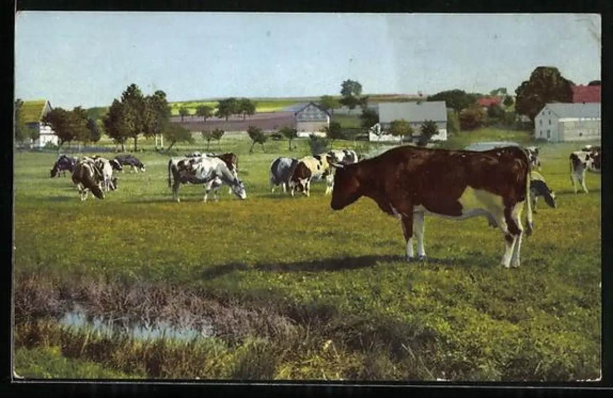 AK Weidende Kühe und Gebäude, rückseitig Reklame Selbmann-Schokolade