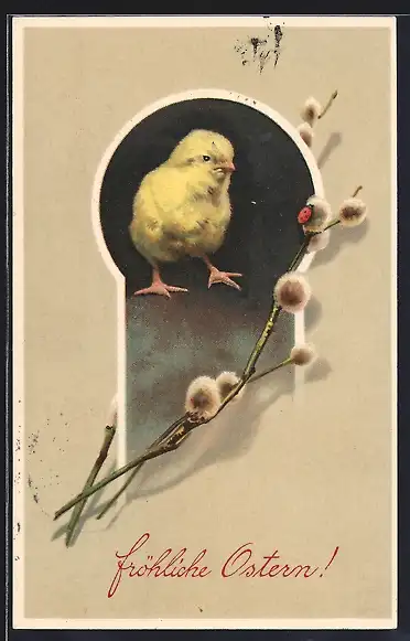 AK Weidenkätzchenzweige mit Maikäfer und Osterküken