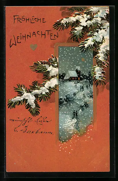 AK Weihnachten, verschneite Kirche mit Tannenzweigen