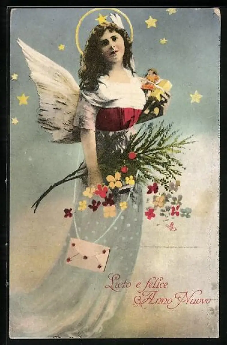 AK Weihnachtsengel mit Blumen und Brief, Lieto e felice Anno Nuovo