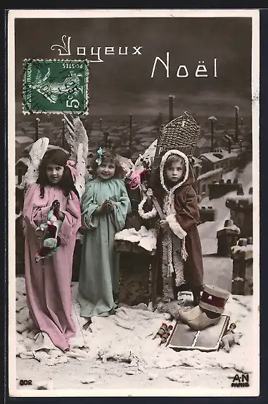 AK Weihnachtsengel mit Geschenken vor verschneiter Stadt