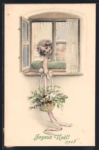 AK Weihnachtsengel mit Korb und Mistelzweig am Fenster