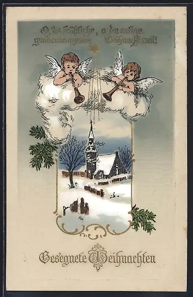 AK Weihnachtsengel musizieren über verschneiter Kirche
