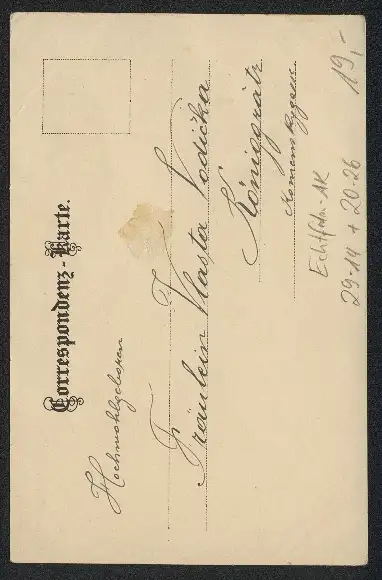Personenbezogene Daten auf der Rückseite der Karte wurden durch blauen Textmarker unkenntlich gemacht. Die blauen Stellen sind auf die Vorderseite durchgeweicht und wirken sich negativ auf das Postkartenfoto aus