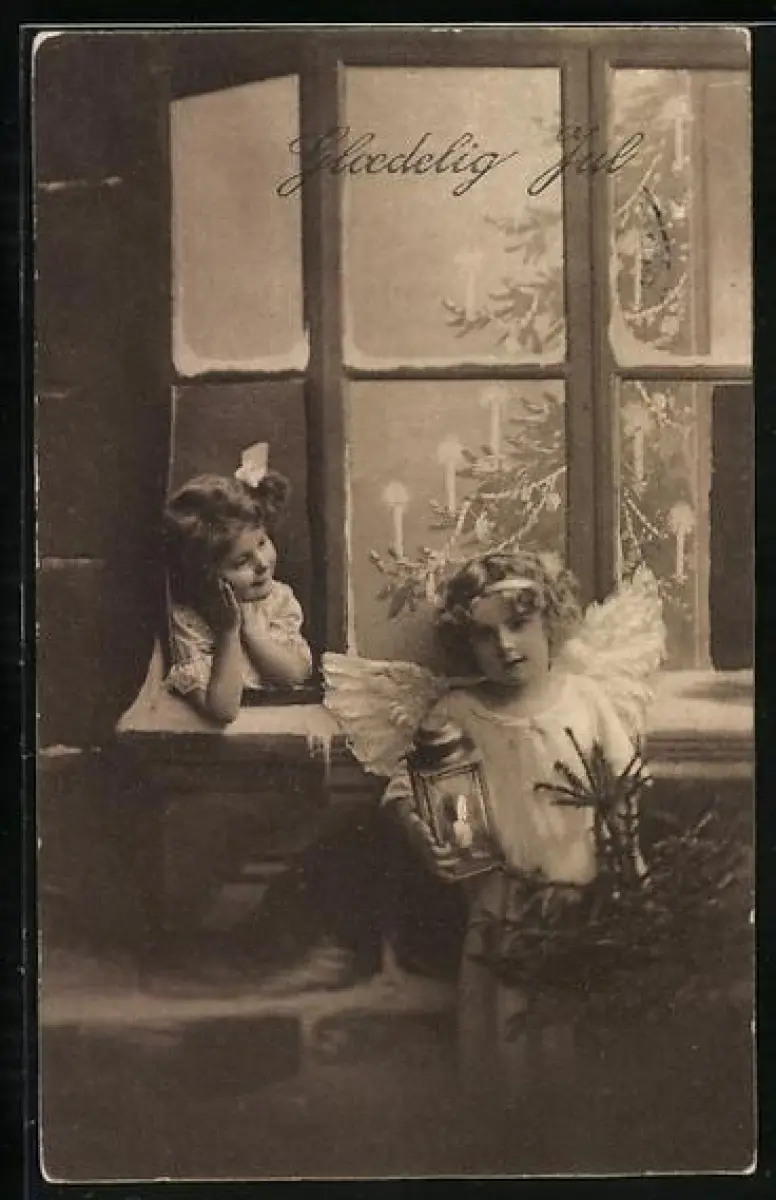 AK Weihnachtsengel steht mit einer Laterne vor einem Fenster, Glaedelig Jul