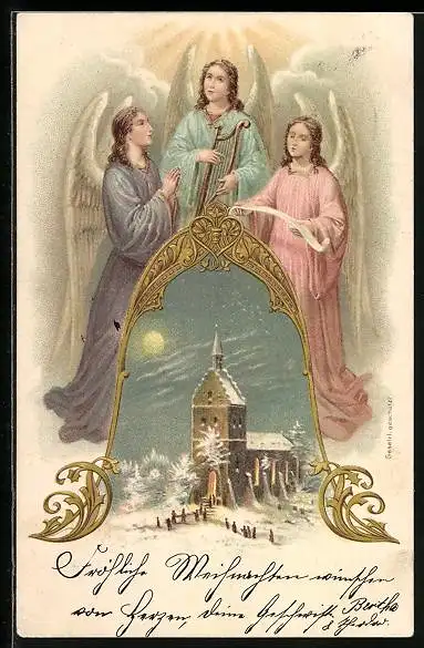 AK Weihnachtsengel über einer verschneiten Kirche