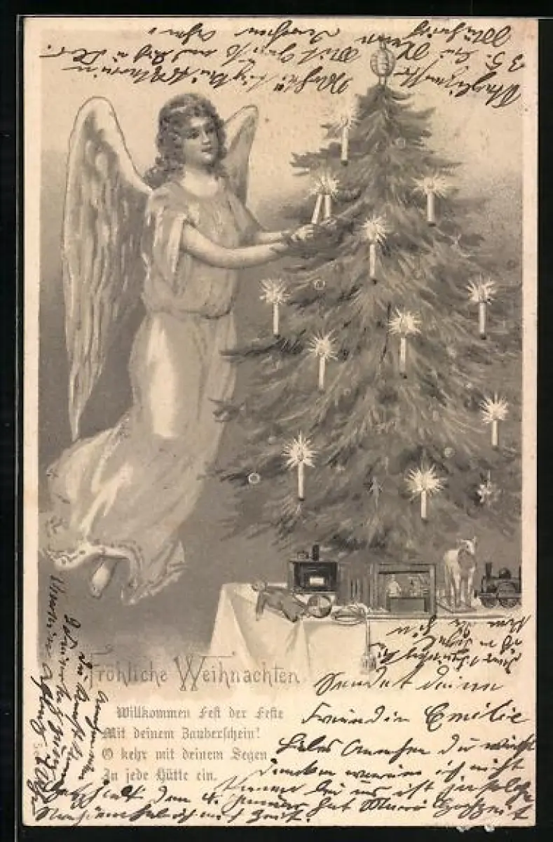 AK Weihnachtsengel zündet Kerzen an einem Weihnachtsbaum an
