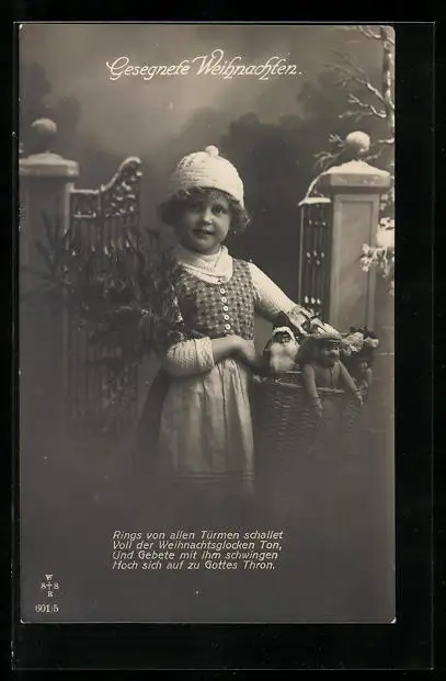 AK Weihnachtsgruss, Mädchen mit Steiffpuppen im Korb