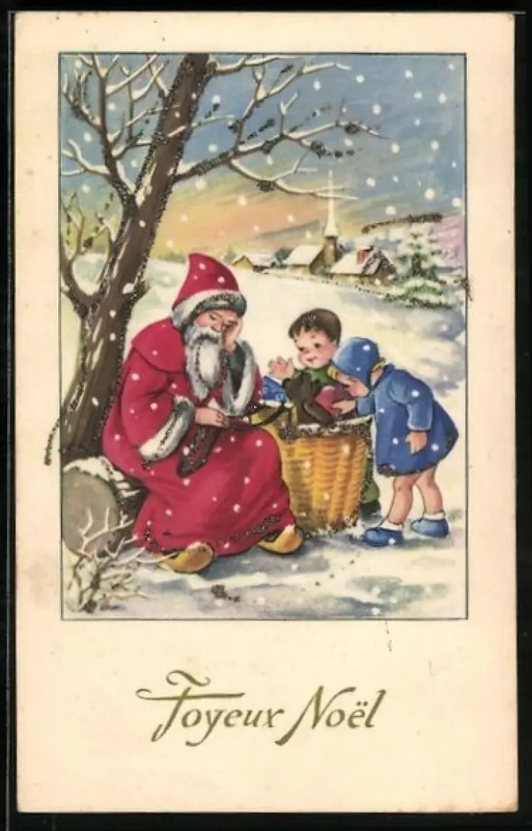 AK Weihnachtsmann beschenkt zwei Kinder unter einem Baum