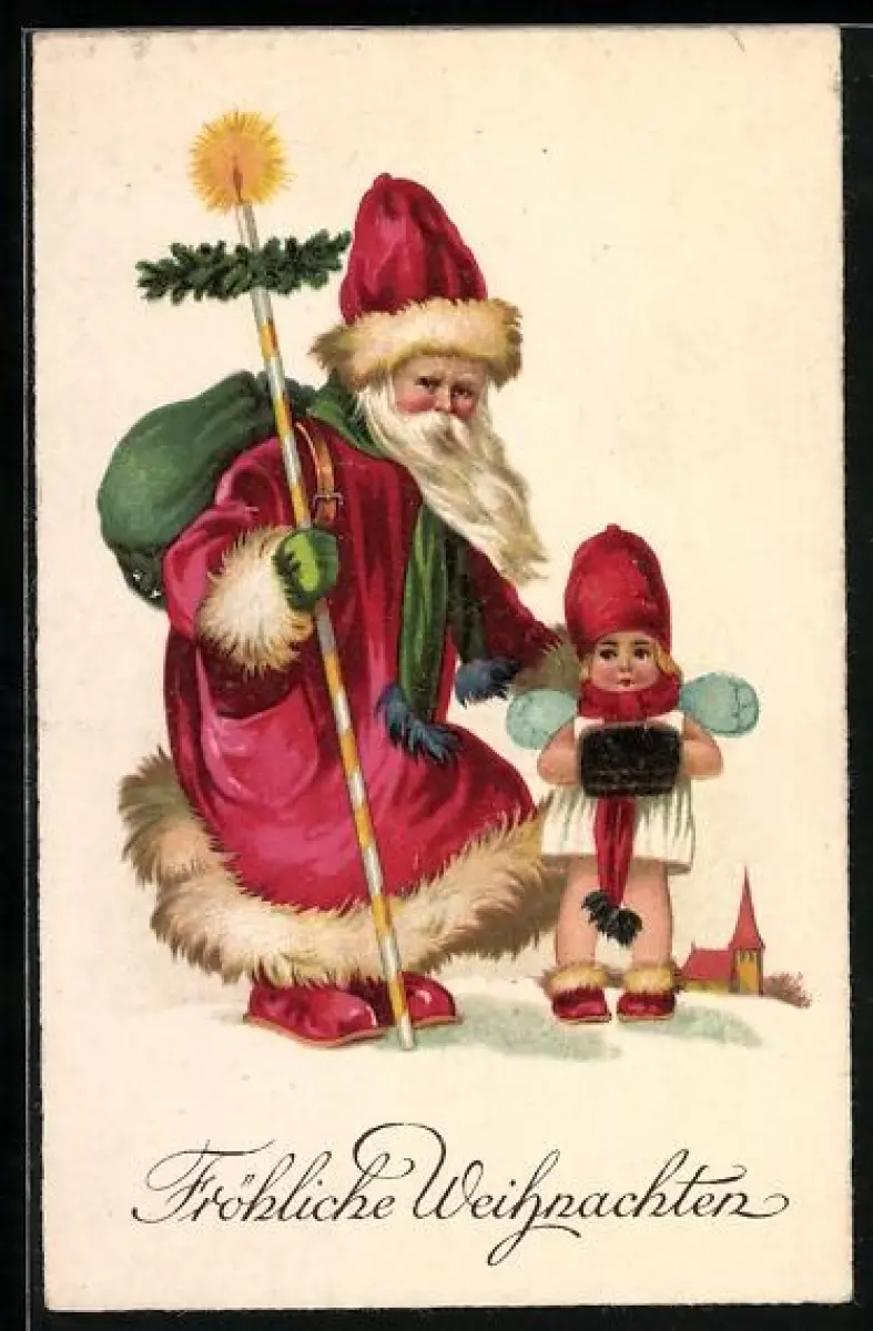 AK Weihnachtsmann erscheint mit Engel im verschneiten Dorf