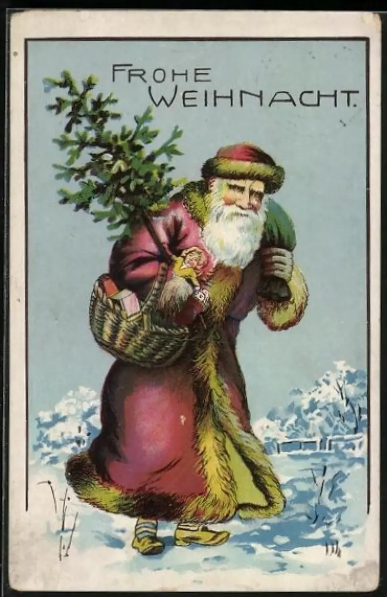 AK Weihnachtsmann geht mit Sack, Tannenbaum u. Geschenken durch d. Schnee