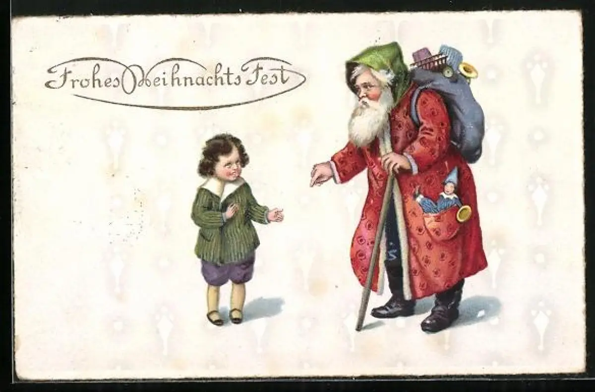 AK Weihnachtsmann mit Geschenken spricht mit kleinem Mädchen
