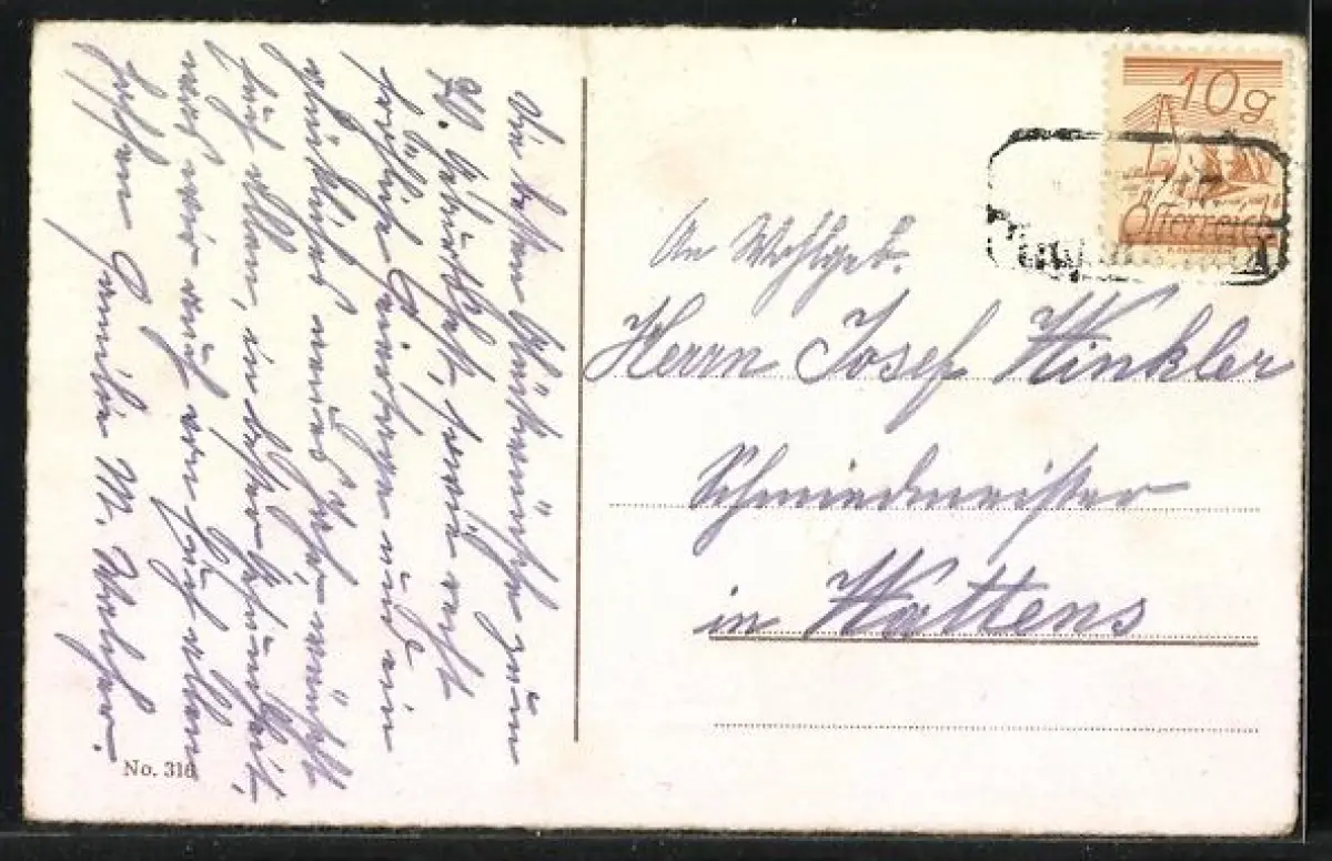 Personenbezogene Daten auf der Rückseite der Karte wurden durch blauen Textmarker unkenntlich gemacht. Die blauen Stellen sind auf die Vorderseite durchgeweicht und wirken sich negativ auf das Postkartenfoto aus