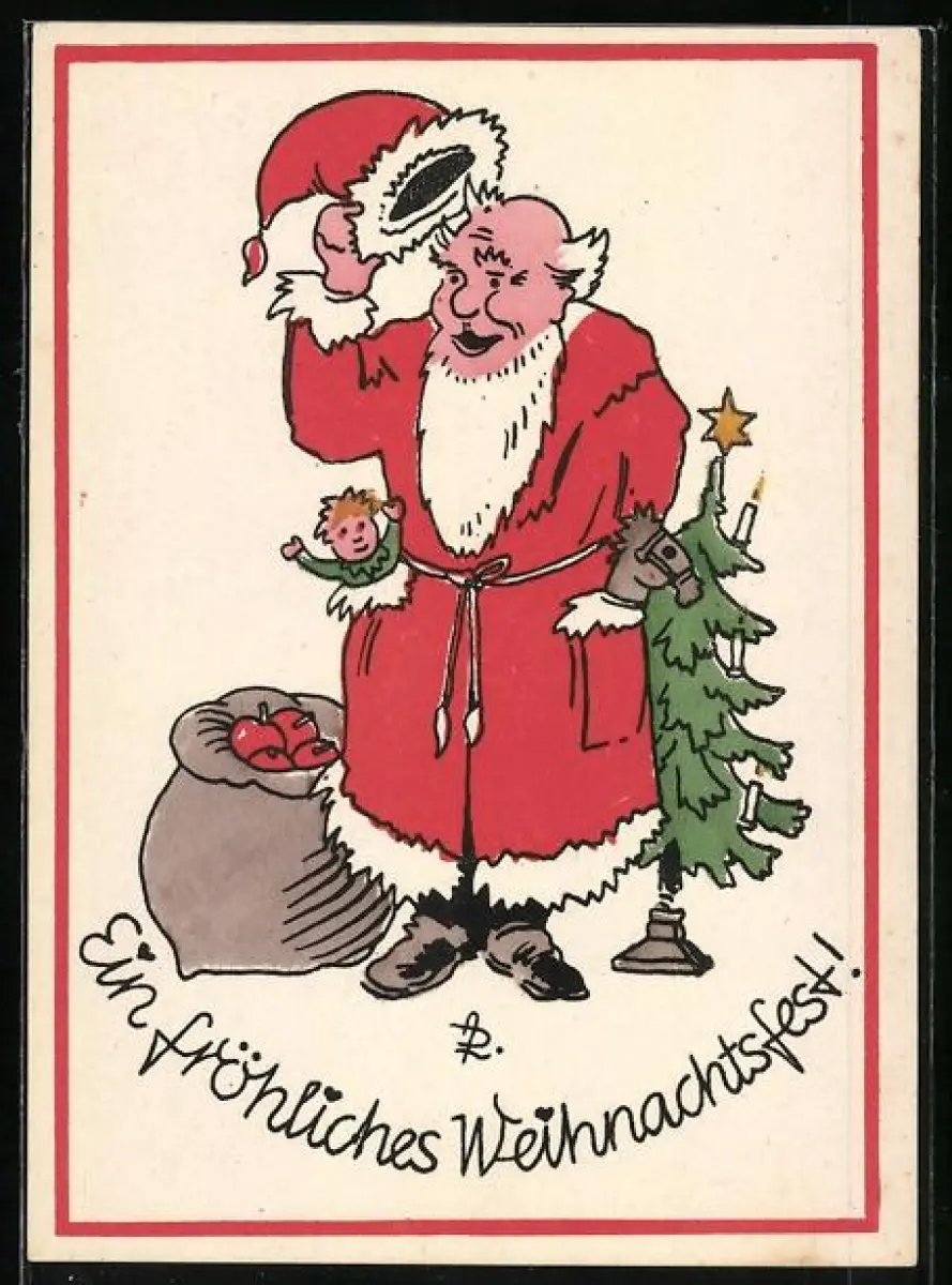 AK Weihnachtsmann mit Spielzeug und Äpfeln