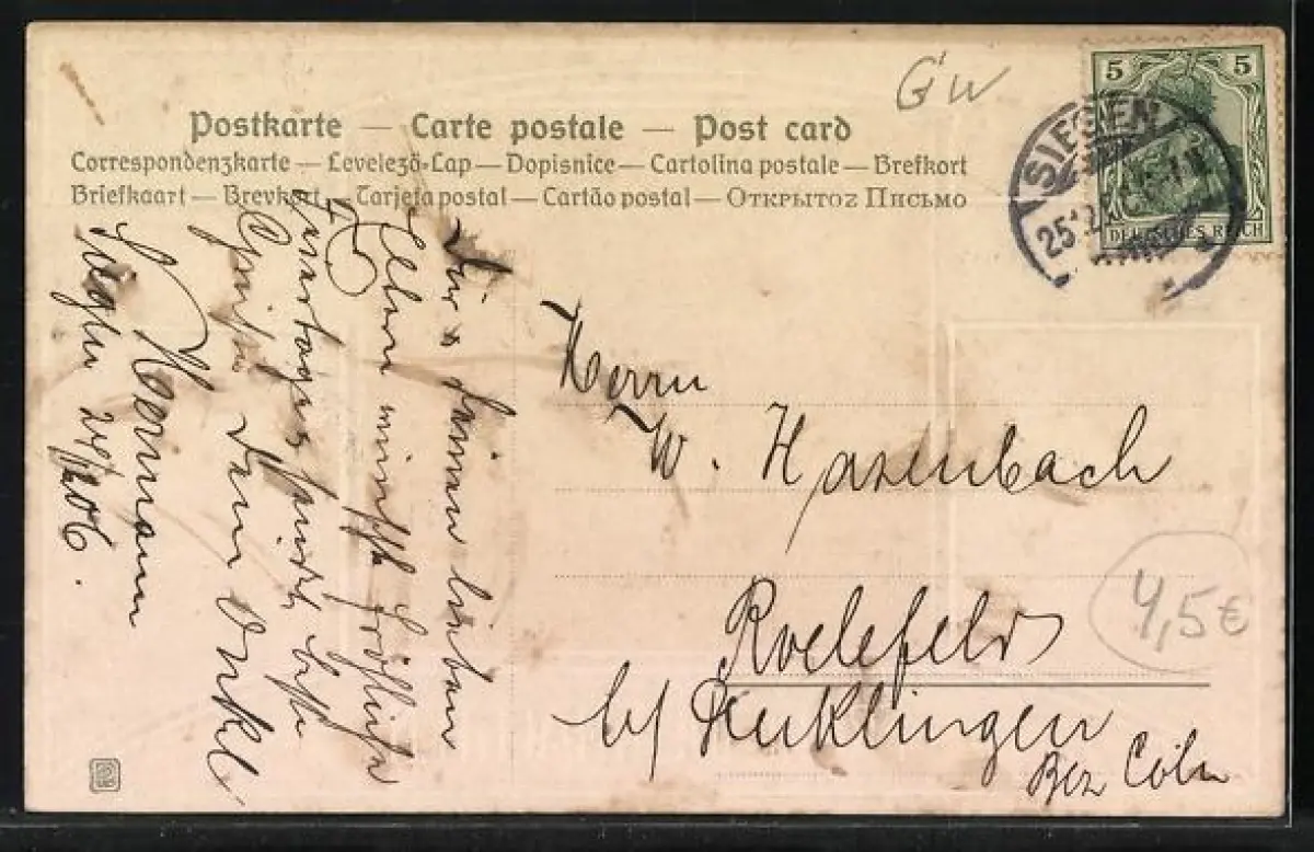 Personenbezogene Daten auf der Rückseite der Karte wurden durch blauen Textmarker unkenntlich gemacht. Die blauen Stellen sind auf die Vorderseite durchgeweicht und wirken sich negativ auf das Postkartenfoto aus