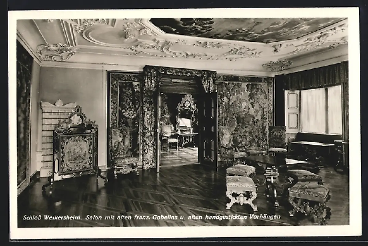 AK Weikersheim, Schloss, Salon mit alten französischen Gobelins und handgestickten Vorhängen