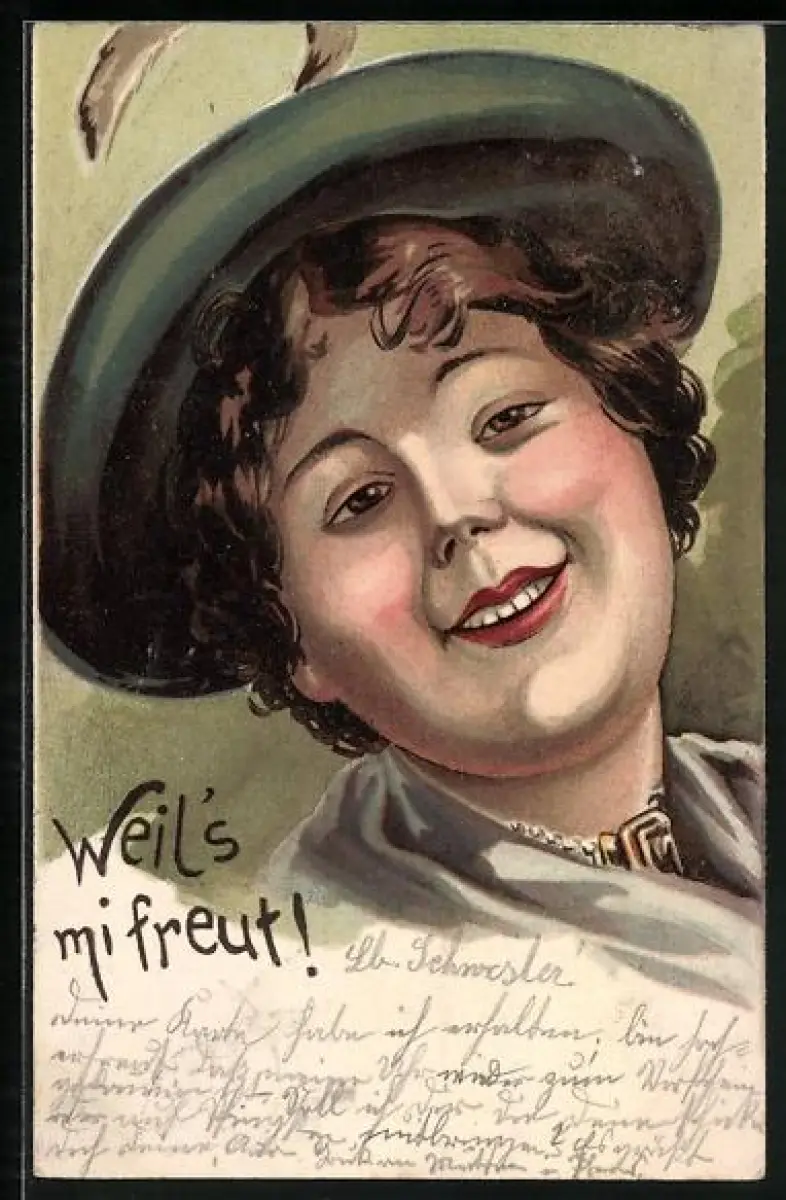 AK Weil`s mi freut, Gesicht einer lächelnden Frau mit Hut