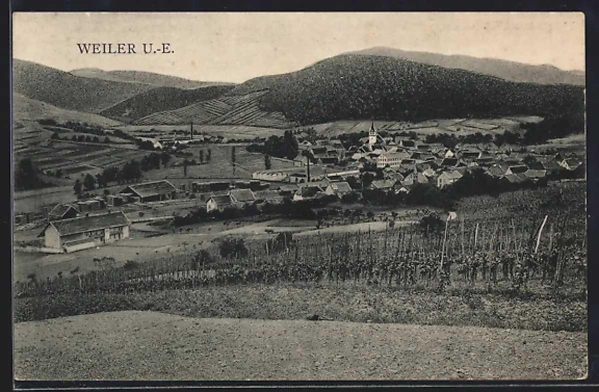 AK Weiler, Totalansicht von einer Anhöhe aus, Weinstöcke im Vordergrund am Hang