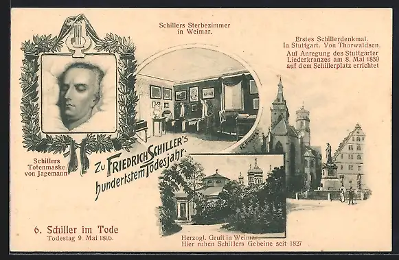 AK Weimar, Friedrich Schiller`s Sterbezimmer, erstes Schillerdenkmal in Stuttgart, Gruft in Weimar, Totenmaske