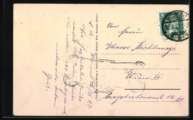 Personenbezogene Daten auf der Rückseite der Karte wurden durch blauen Textmarker unkenntlich gemacht. Die blauen Stellen sind auf die Vorderseite durchgeweicht und wirken sich negativ auf das Postkartenfoto aus