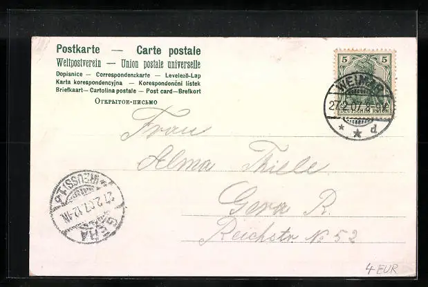alte Ansichtskarte, gelaufen 1907, Eckknick oben re., guter Zustand