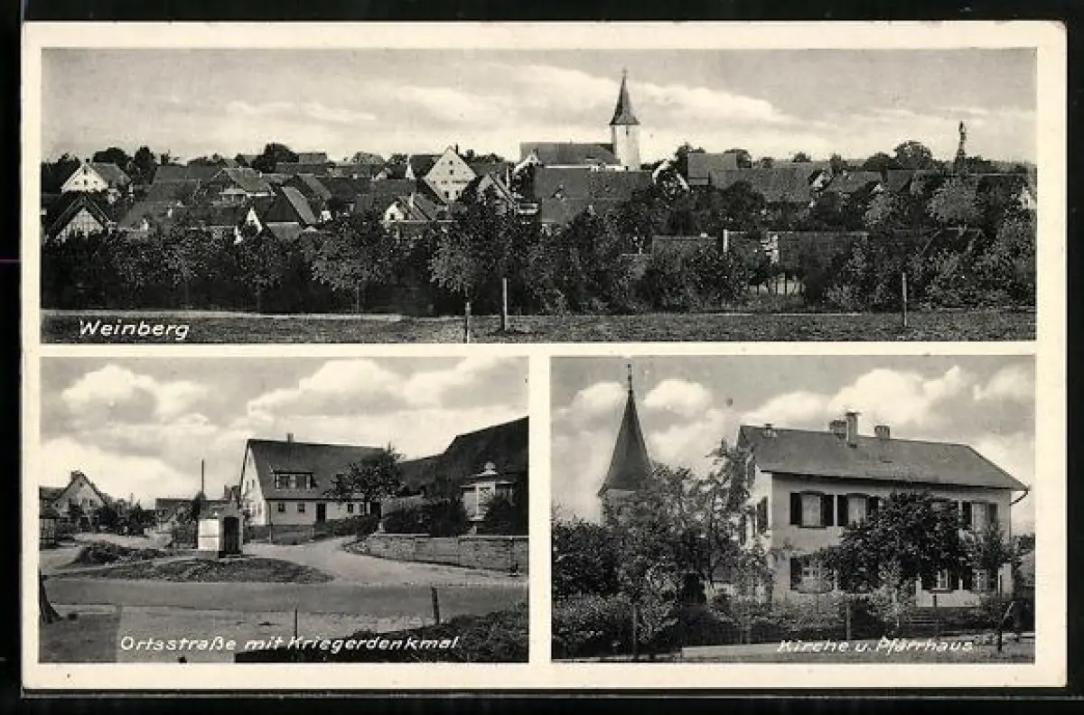 AK Weinberg, Ortsstrasse mit Kriegerdenkmal, Kirche und Pfarrhaus