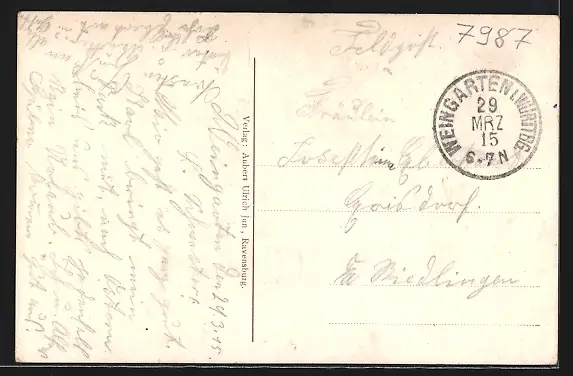 Personenbezogene Daten auf der Rückseite der Karte wurden durch blauen Textmarker unkenntlich gemacht. Die blauen Stellen sind auf die Vorderseite durchgeweicht und wirken sich negativ auf das Postkartenfoto aus
