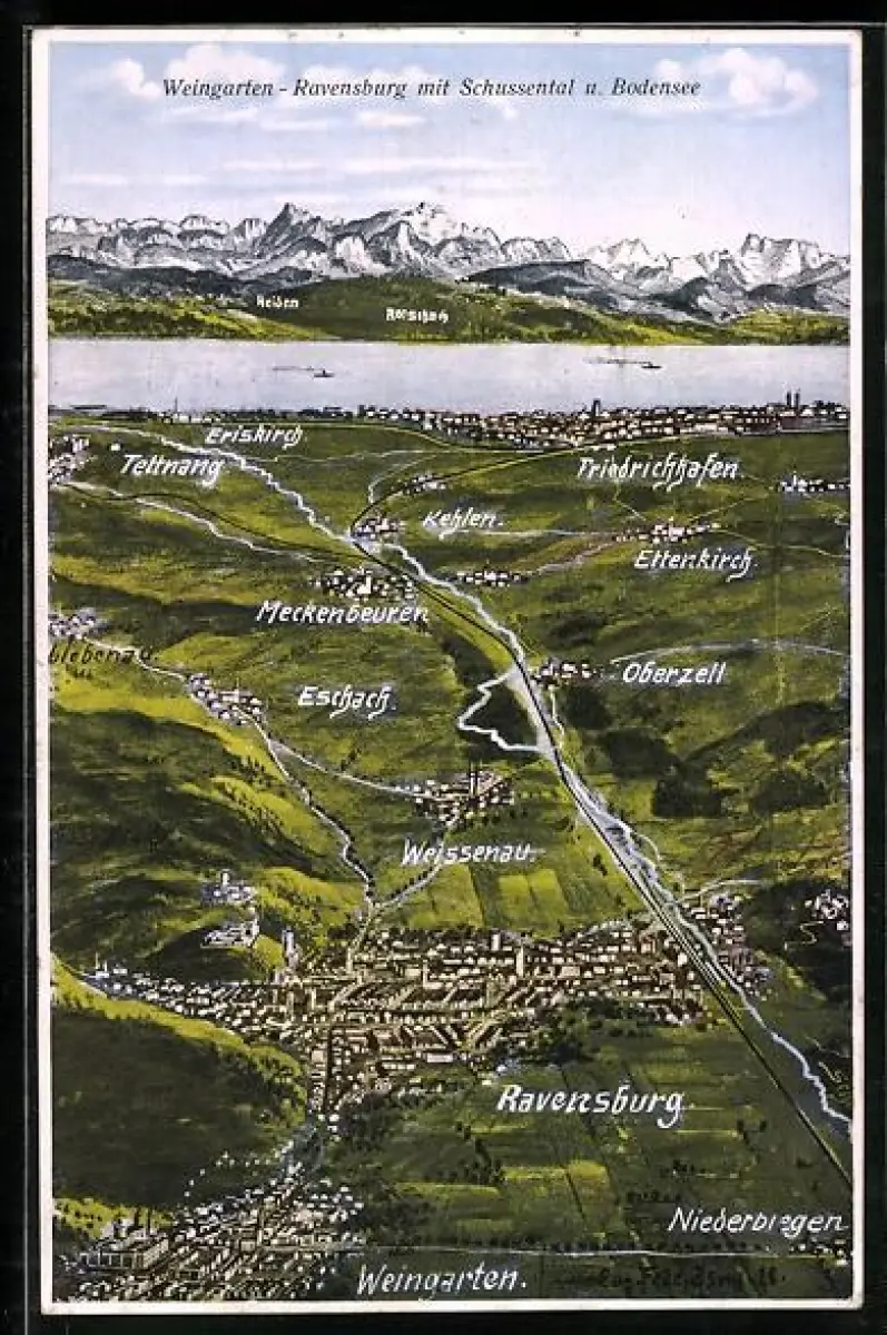 AK Weingarten / Württ., Schussental, Bodensee, Übersicht mit Friedrichshafen, Meckenbeuren, Tettnang