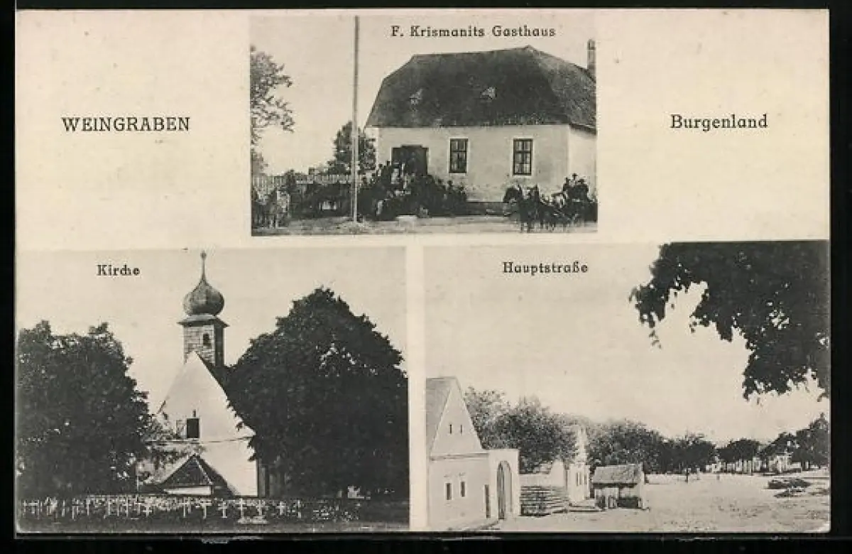 AK Weingraben /Burgenland, F. Krismanits Gasthaus, Partie in der Hauptstrasse, Kirche