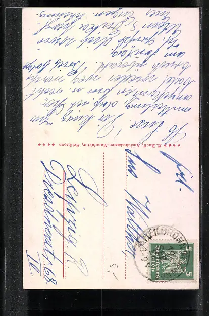 Personenbezogene Daten auf der Rückseite der Karte wurden durch blauen Textmarker unkenntlich gemacht. Die blauen Stellen sind auf die Vorderseite durchgeweicht und wirken sich negativ auf das Postkartenfoto aus
