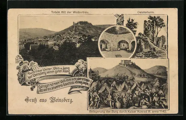AK Weinsberg, Geisterturm, Belagerung 1140, Totalansicht mit Weibertreu