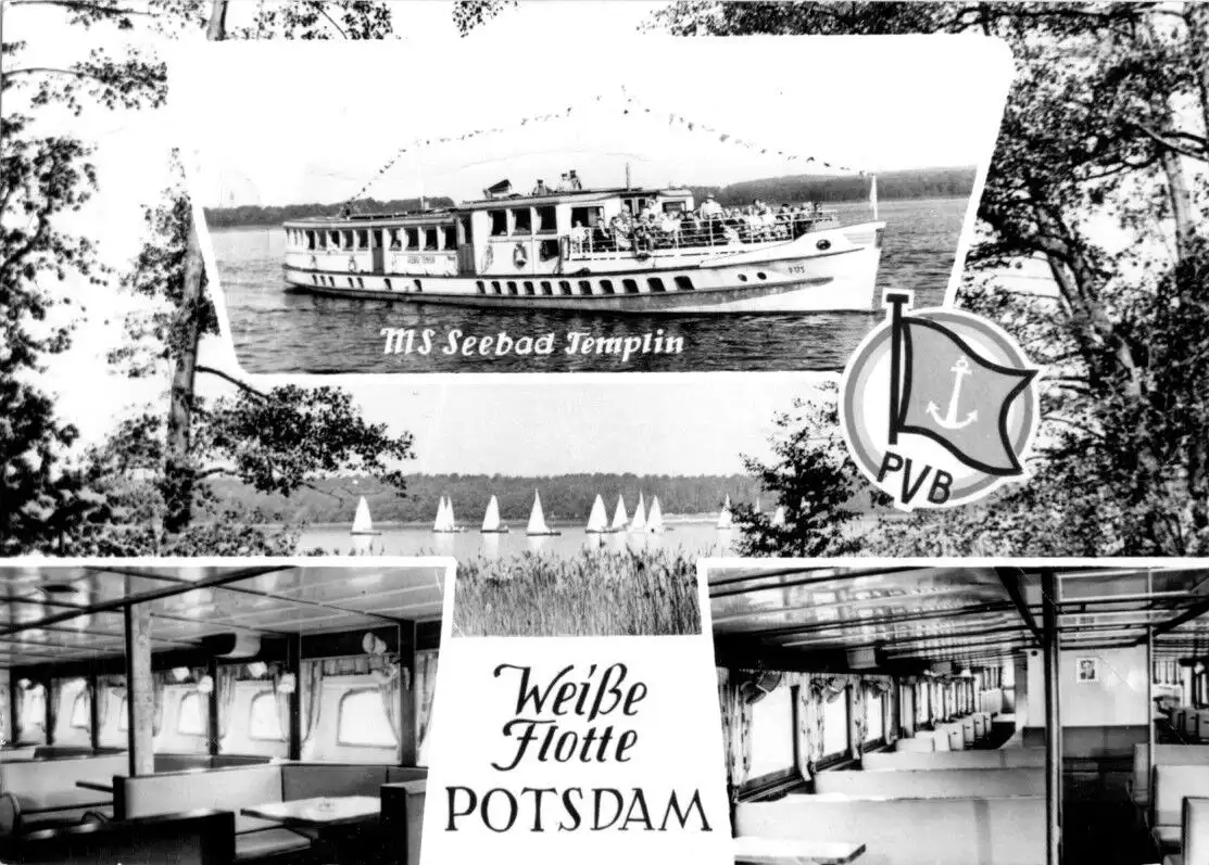 Ansichtskarte Weisse Flotte Potsdam MS "Seebad Templin", vier Abb. Erhaltung I-II Druckart: Fotokarte postalisch gelaufen, gestempelt: Potsdam13.7.70 Druckvermerk: 1970 Herstellungsland: DDR Verlag: PGH Foto-Studio Potsdam