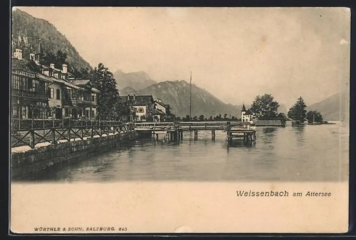 AK Weissenbach am Attersee, Uferpartie mit Anlegestelle