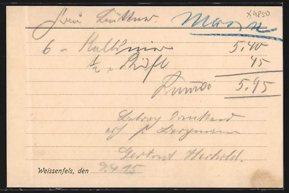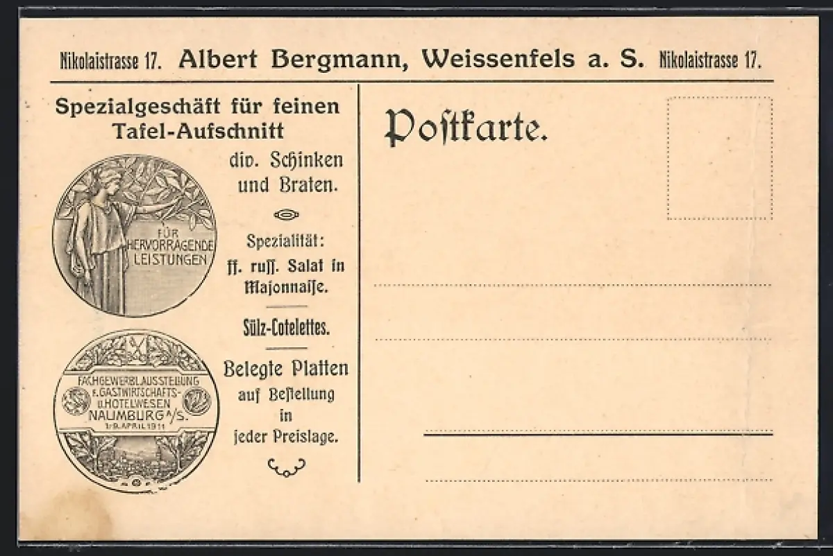 AK Weissenfels a. S., Korrespondenzkarte Albert Bergmann, Spezialgeschäft für feinen Tafel-Aufschnitt