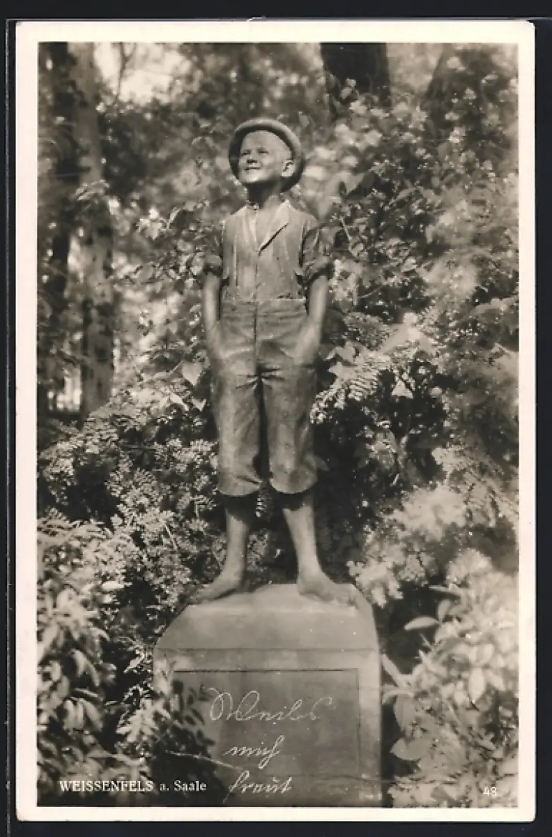 AK Weissenfels a. d. Saale, Statue von barfüssigem Jungen im Grünen