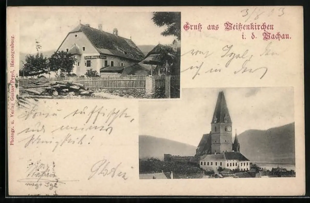 AK Weissenkirchen i. d. Wachau, Gasthaus im Ort, Blick zur Kirche