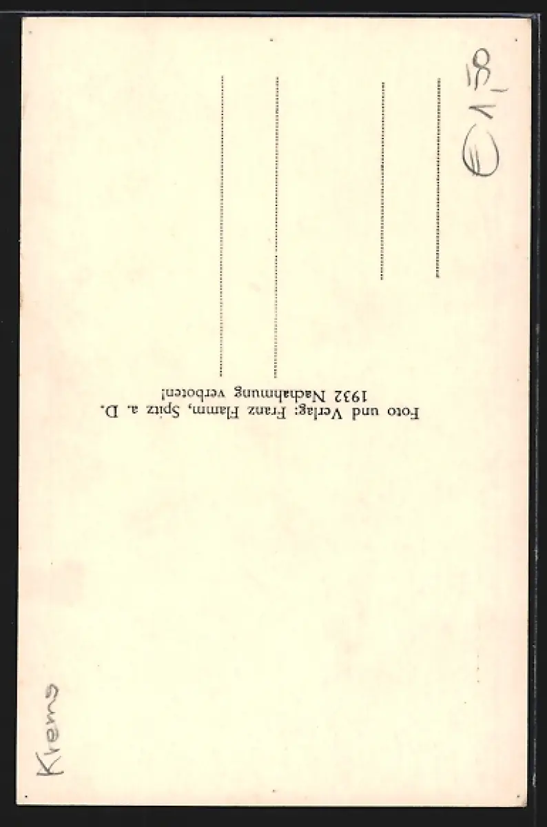 Personenbezogene Daten auf der Rückseite der Karte wurden durch blauen Textmarker unkenntlich gemacht. Die blauen Stellen sind auf die Vorderseite durchgeweicht und wirken sich negativ auf das Postkartenfoto aus