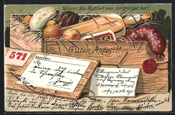AK Weisst Du Mutterl was mir träumt hat?, Lieferung von Wein und Wurst in einer Holzkiste, Guten Appetit!
