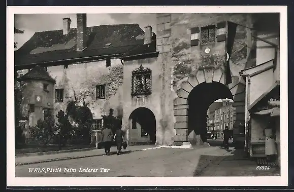 AK Wels, Passanten bei und Blick durch das Lederer Tor