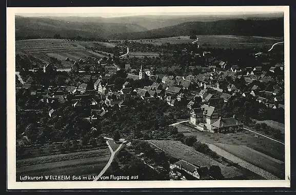 AK Welzheim, Generalansicht der Stadt mit Blick zur Kirche vom Flugzeug aus