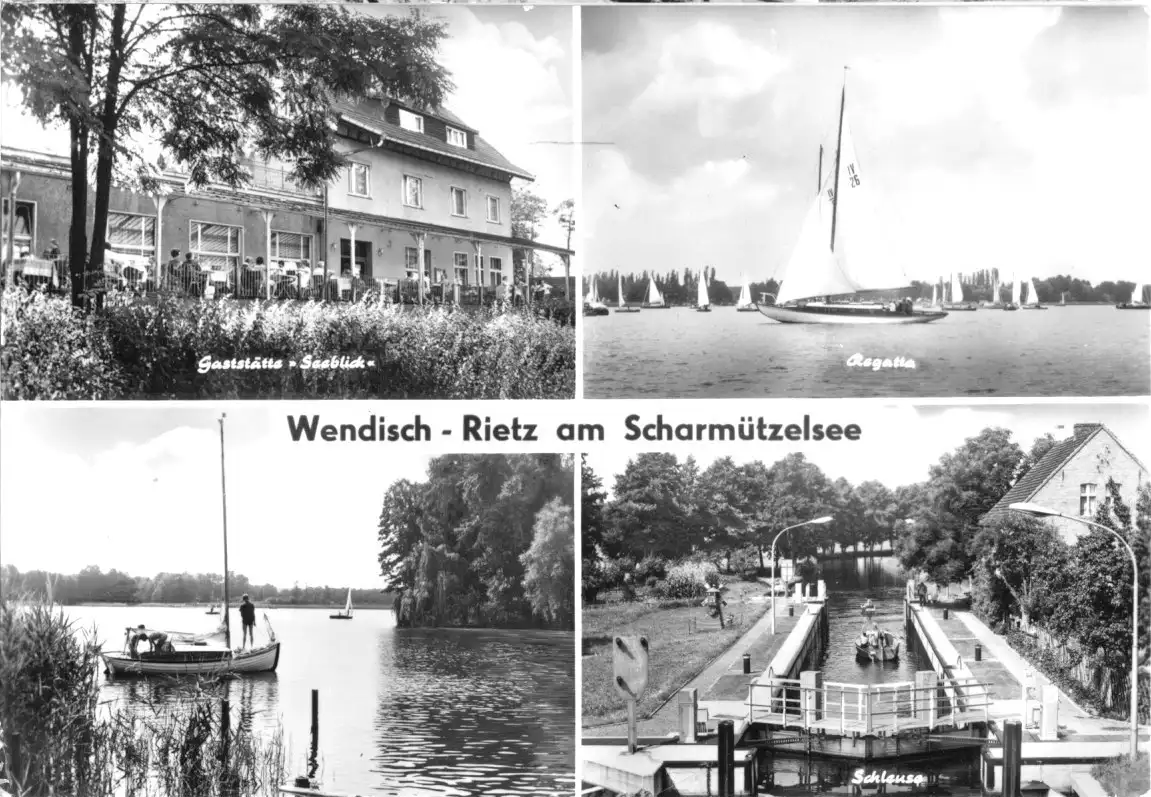 Ansichtskarte Wendisch Rietz vier Abb. - Gaststätte "Seeblick", Regatta, Seepartie, Schleuse Erhaltung I-II, Beförderungsspuren postalisch gelaufen, ungestempelt: Druckvermerk: 1976 Herstellungsland: DDR Verlag: Planet-Verlag Berlin - 02 05 02 344M