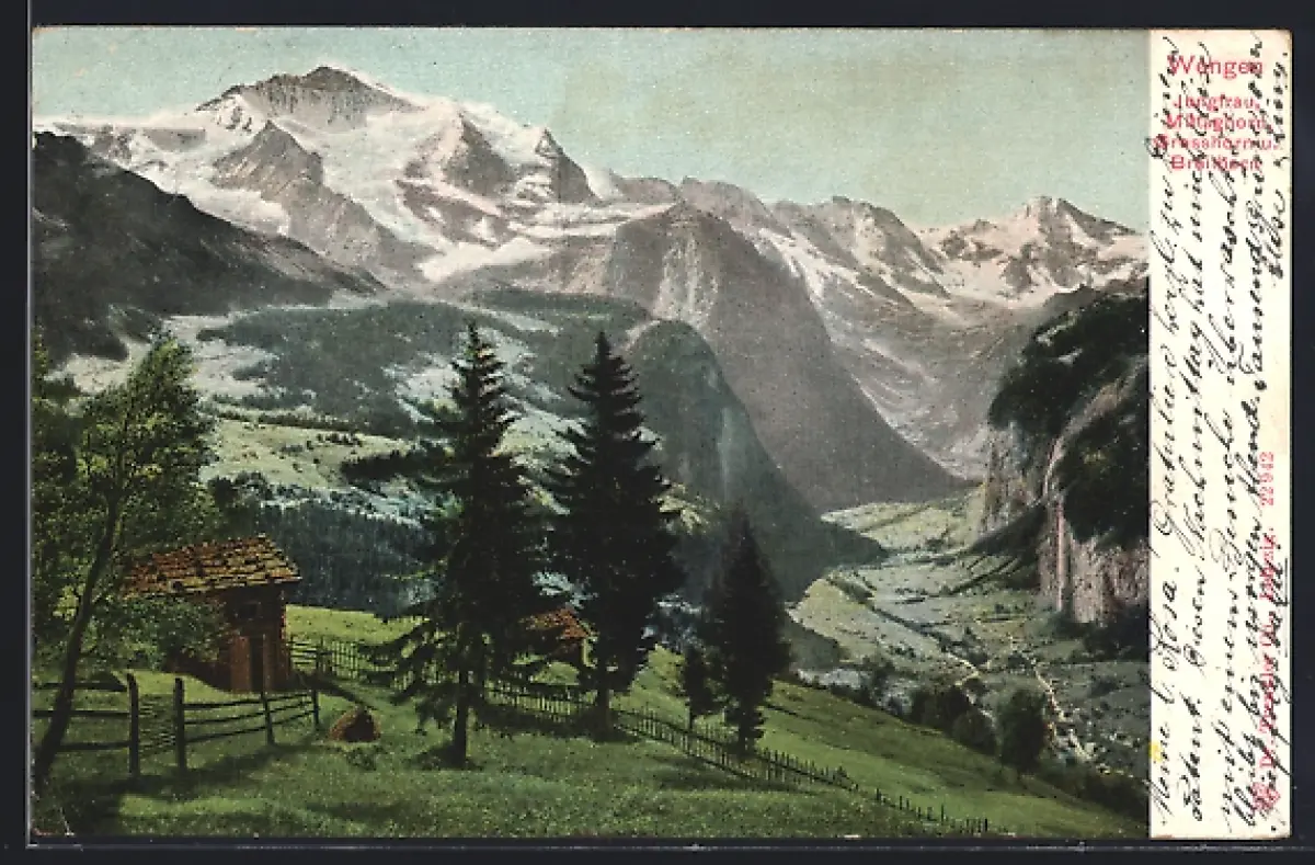 AK Wengen, Bergpartie mit Ortsblick, Jungfrau, Mittag-, Gross- und Breithorn
