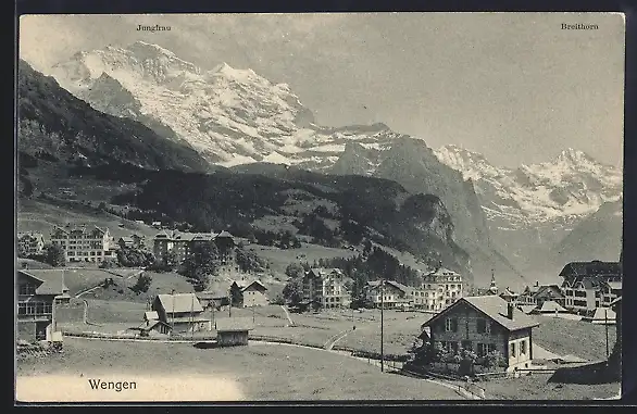 AK Wengen, Ortsansicht mit Jungfrau und Breithorn