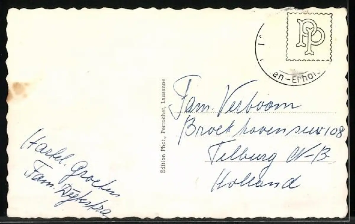 Personenbezogene Daten auf der Rückseite der Karte wurden durch blauen Textmarker unkenntlich gemacht. Die blauen Stellen sind auf die Vorderseite durchgeweicht und wirken sich negativ auf das Postkartenfoto aus
