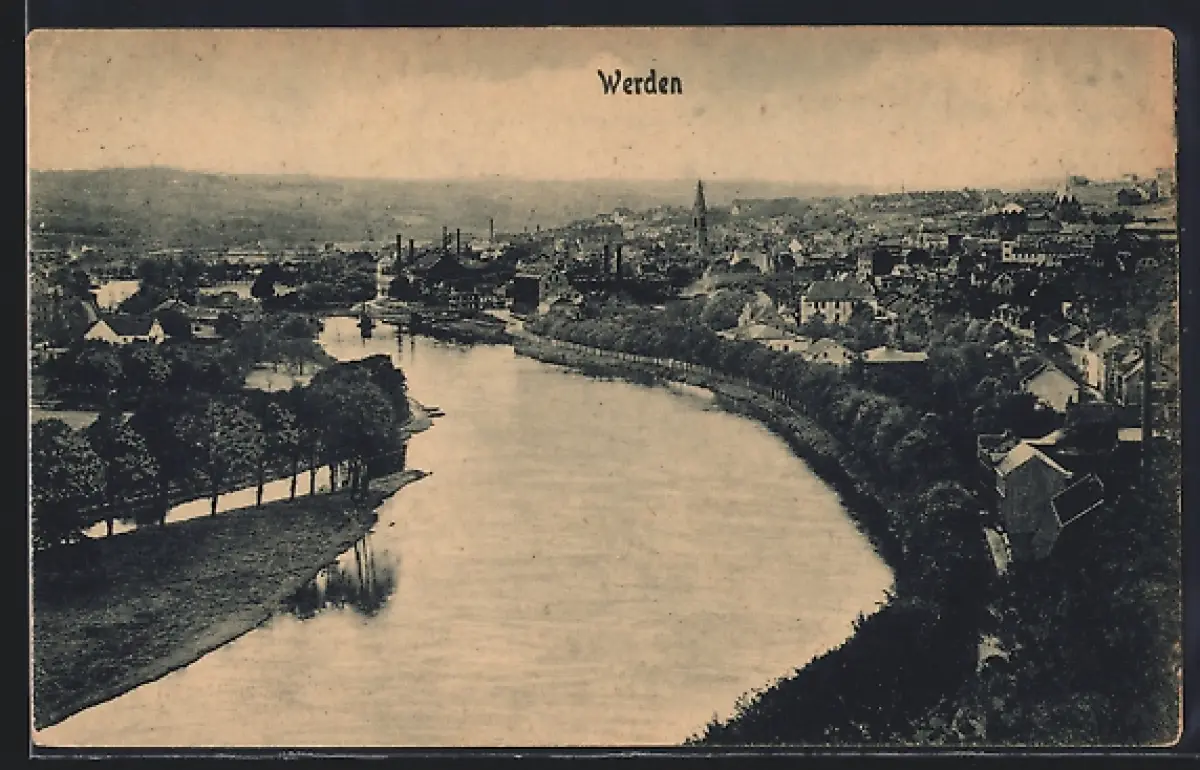 AK Werden, Panorama mit Flusslauf und Stadtansicht