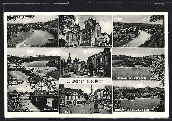 AK Werden a. d. Ruhr, Abteikirche, Stausee mit Bootshaus, Baldeney-See mit Villa Hügel