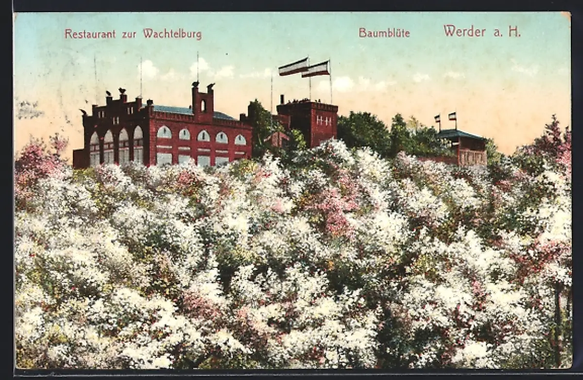 AK Werder a. H., Restaurant zur Wachtelburg mit Baumblüte