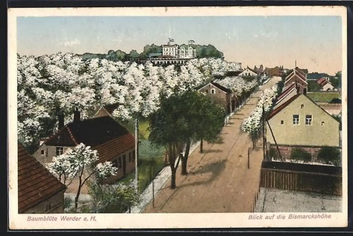 AK Werder a. H., Strassenblick zur Bismarckshöhe ur Baumblüte