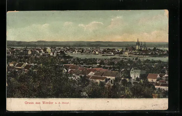 AK Werder a. d. Havel, Totalansicht mit Fluss und Kirche