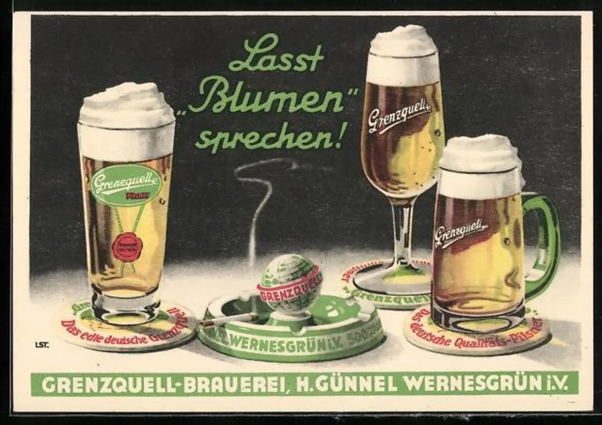 AK Wernesgrün, Brauerei-Werbung Grenzquell, Biergläser und brennende Zigarette
